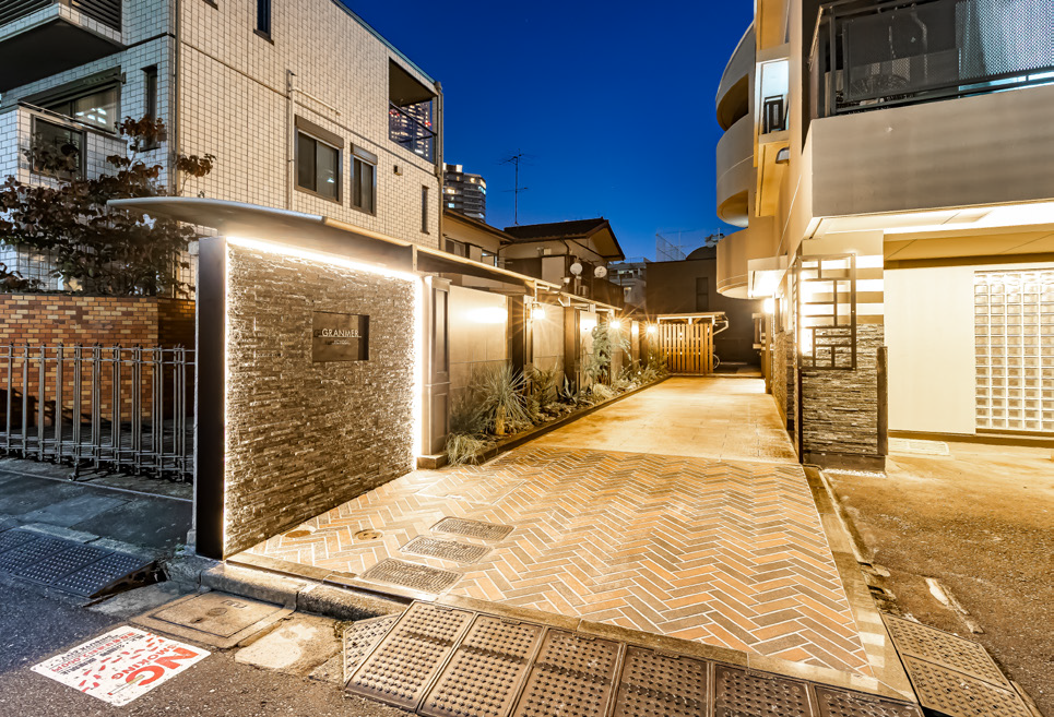 夜間には照明計画が映え、静穏な私邸へと誘う品格ある導線を形成しました。